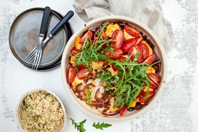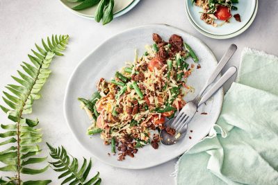 Orzo eli jyväpasta valmistuu näppärästi yhdellä pannulla. Valkosipulilla maustettuja Mureita & Meheviä Suikaleita voi käyttää kuin kanasuikaleita, ja ne tuovatkin kasvisten kaverina makua vegaaniseen yhden pannun orzoon.